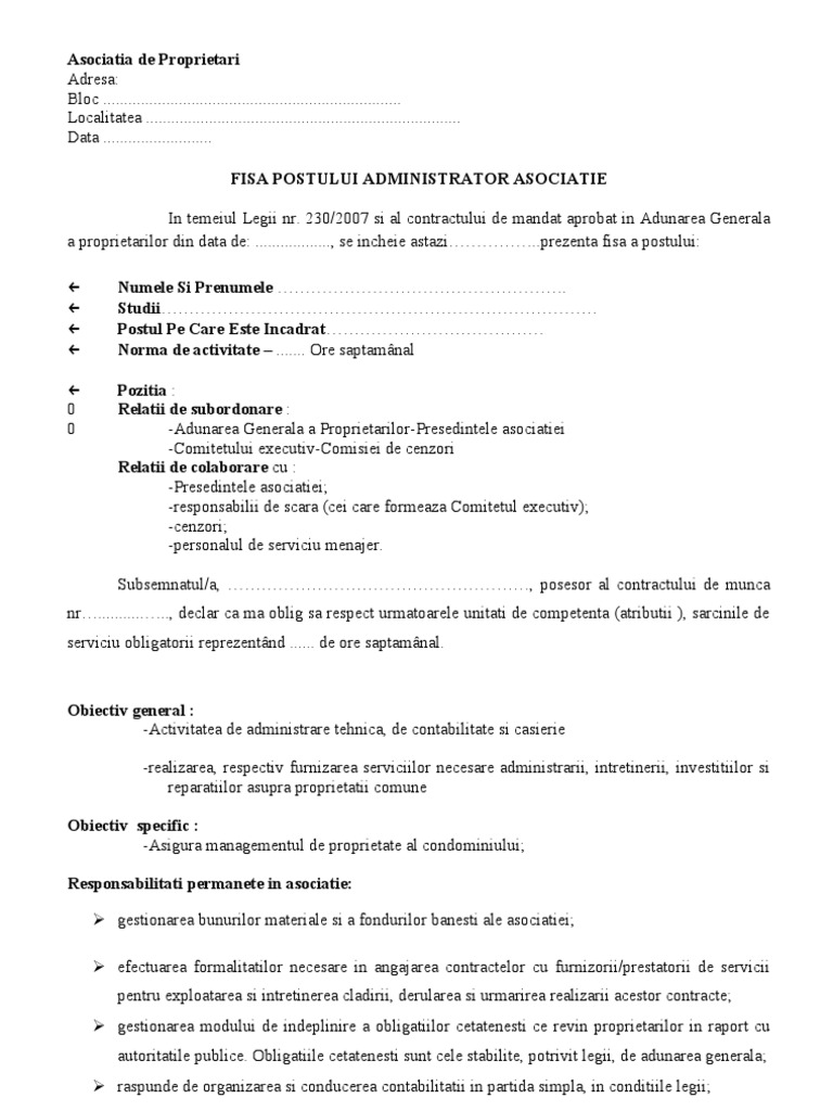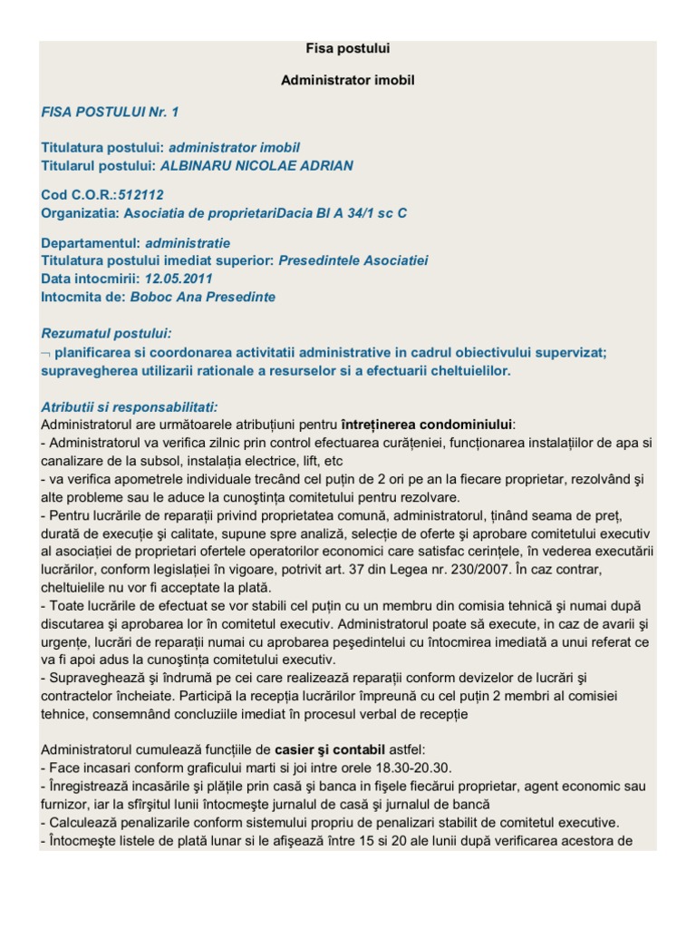 515104 administrator fisa postului fise de post fisa post regulament de ordine interioara. Fisa postului administrator de bloc author. Numai daca este cazul 7. Numele si prenumele salariatului.