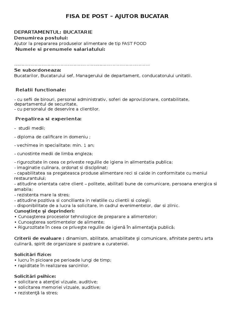Fisa postului ajutor bucatar. A fi un bucatar sef un bucatar sau un ajutor bucatar poate fi cea mai dificila munca pe care o veti iubi vreodata. Related items bucatar fisa postului. O fisa post ajutor de bucatar include mai multe aspecte insa cele mai importante dintre ele sunt partile complicate pe care nimeni nu le spune la angajare. Fisa postului 0.
