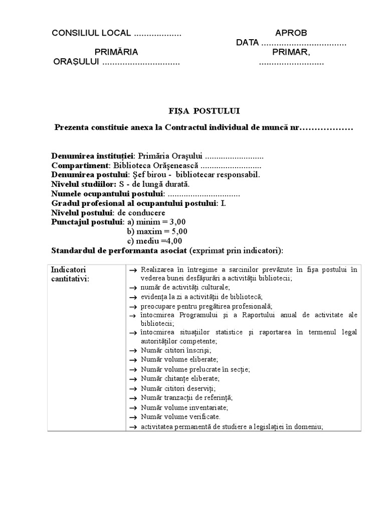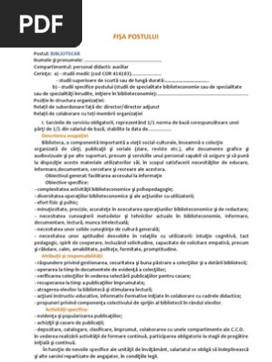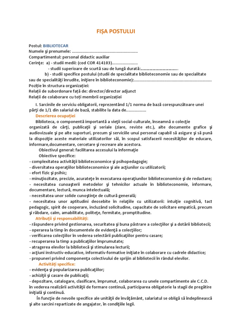 Fisa postului bibliotecar. Din 27 01 2012 fişa cadru a postului pentru personalul didactic auxiliar bibliotecar. Fişa postului pentru bibliotecar actualizata anul şcolar 2018 2019. Aprobată prin omects nr. Atestat de bibliotecar acordat de ministerul culturii şi cultelor sau.