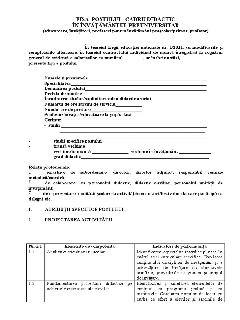 1 fi şa de evaluare a fost aprobată în edin ţa consiliului de administraie al isj gorj din data de 09 01 2020 în conformitate cu prevederile metodologiei cadru privind mobilitatea personalului didactic în anul colar 2020 2021 aprobată prin omec nr. 24 2020 privind organizarea si functionarea ministerului educatiei si cercetarii ministrul educatiei si cercetarii emite prezentul ordin. Fişa cadru a postului cadru didactic în învăţământul preuniversitar în temeiul legii educaţiei naţionale nr. Fişa postului anul.