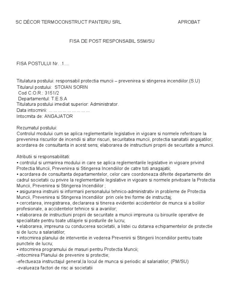Jurisprudenta dreptul muncii fisa postului raspunderea patrimoniala a salariatului nu poate fi angajata in conditiile in care atributiile sale nu au fost stabilite intr o fisa a postului hotararea 106 r din 13 01 2009 pronuntata de curtea de apel bucuresti. Fisa postului pentru specialist sanatate si securitate in munca regasiti mai jos o fisa de post pentru specialist sanatate si securitate in munca cod cor 226302. Sofer mecanic sef birou transporturi. Iata ce articole din codul muncii contin prevederi ce afecteaza fisa postului.