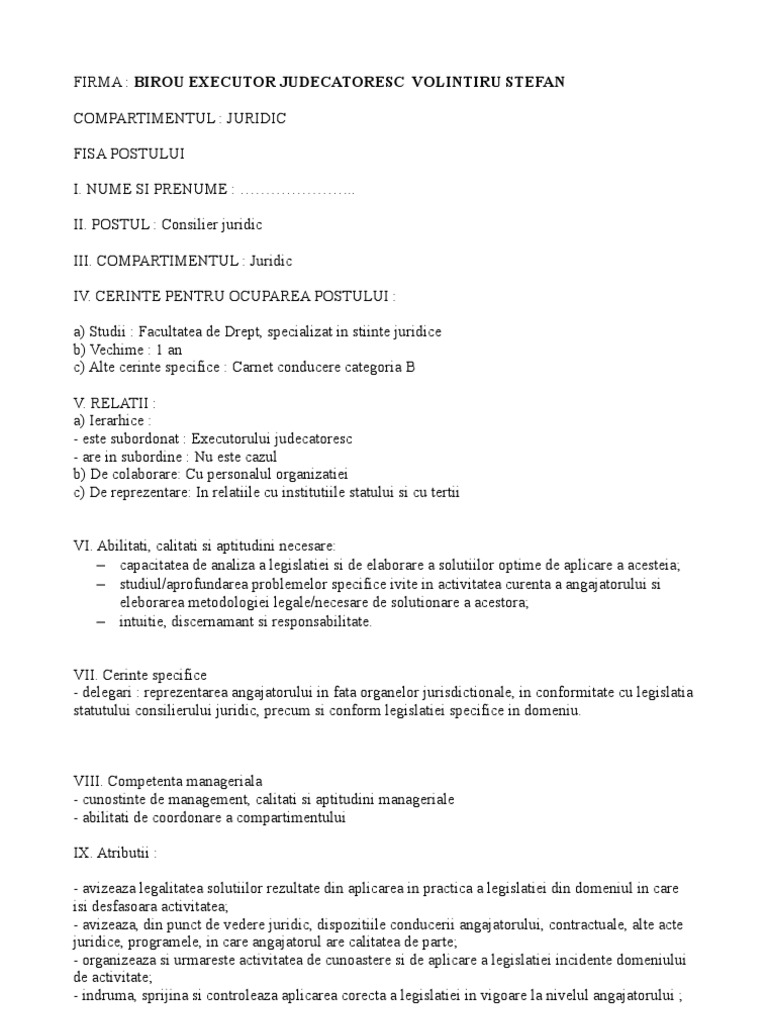 Fisa postului consilier juridic. Denumirea postului difera de cea din cor va trebui sa mentionati in fisa. Nume si prenume salariat 4. Contract de munca incheiat cu angajatorul cu remuneratie negociata pentru serviciile prestate la lit. Biroul juridic resurse umane.