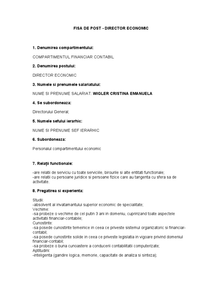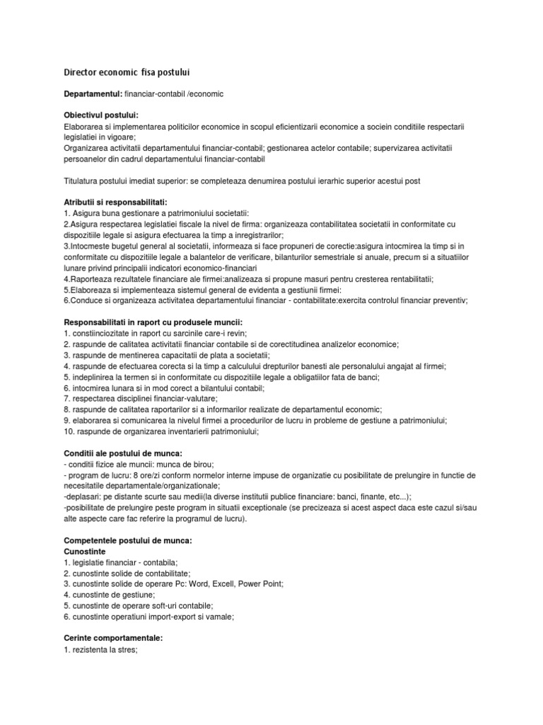 Fisa de post pentru director economic de mihaela croitoru 20 iul. Fisa de post director magazin. Va oferim un model orientativ pentru elaborarea fisei postului pentru postul de director economic cod c o r. Denumirea postului diferă de cea din cor va trebui să menţionaţi în fişă şi denumirea din cor 3.