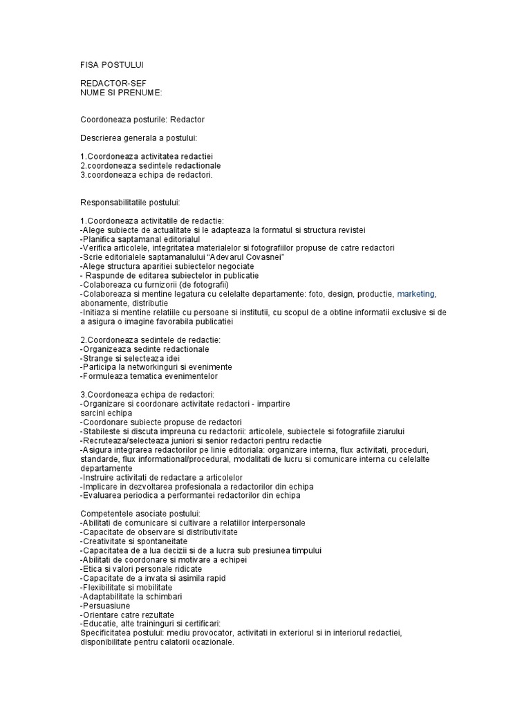 Fisa postului fotograf. Fisa postului fotograf. Descrierea postului efectueaza fotografie de specialitate pentru produse din fashion retail pentru magazinul online prelucrarea imaginilor in photoshop. Fisa postului pentru asistenta medicala medicina dentara. Numele si prenumele titularului.