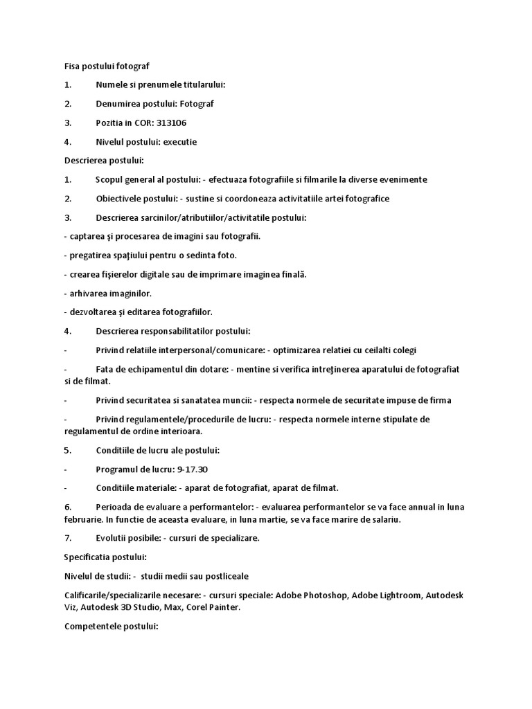 Fisa postului fotograf fisa evaluare profesionala personalizata raport evaluare calculator si documente cu explicatii.