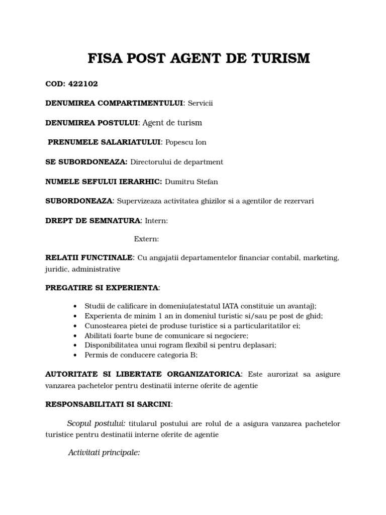Fisa postului ghid de turism fisa evaluare profesionala personalizata raport evaluare calculator si documente cu explicatii. 25 00 lei tva. Numele si prenumele salariatului. Planificarea organizarea si coordonarea programelor turistice interne excursii circuite programe de week end pentru grupuri sau turisti individuali.