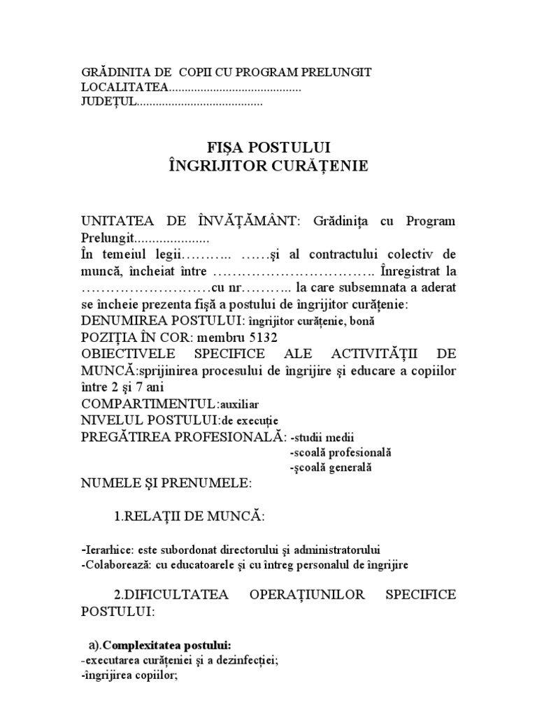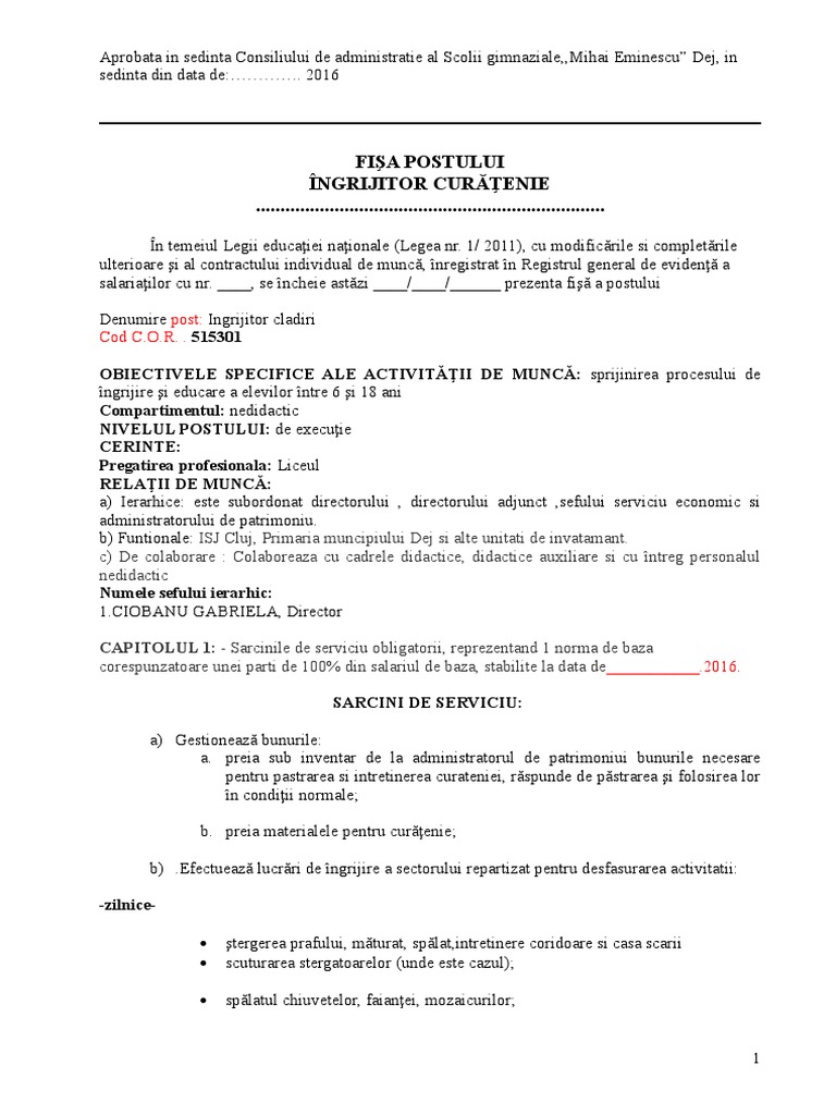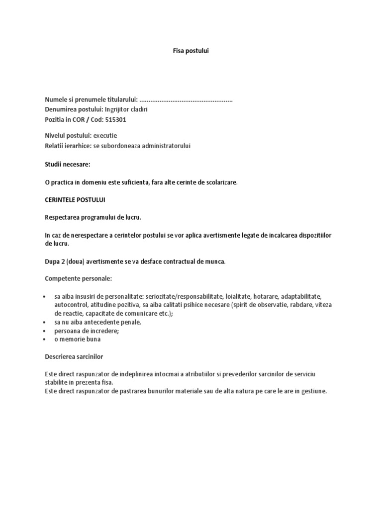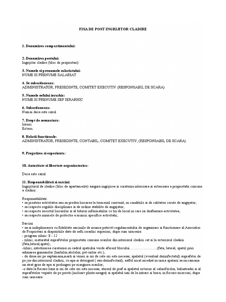 Fise de post model fisa de post pentru ingrijitor cladiri de mara dobrin 24 oct. Nume si prenume sef ierarhic 6. 2017 1782 iata un model de fisa de post pentru un ingrijitor de cladiri conform portalcodulmuncii ro. Ingrijitor cladire bloc de proprietari 3.