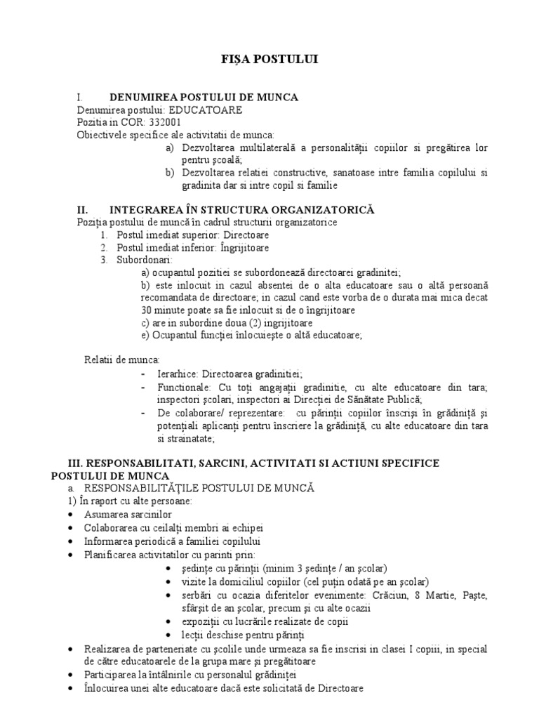 Acest site foloseste cookie uri conform noului regulament de protectie a datelor gdpr pentru a va asigura cea mai buna experienta online. Articole similare model fisa de post pentru manager financiar model fisa postului maistru mecanic cod cor 311508 fisa de post director magazin cele mai importante documente in legislatia muncii si hr model fisa postului specialist relatii publice cod cor 243201. Grupa majora 2 specialisti in diverse domenii de activitate subgrupa majora 23 specialisti in invatamant grupa minora 234 profesori in invatamantul primar si prescolar. Fisa postului invatator documente evaluare profesionala.