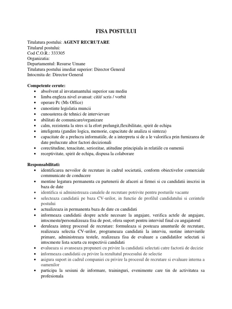 Fisa postului junior recruiter. Scopul general al postului economistul contabil este persoana care isi desfasoara activitatea in compartimentul financiar contabil al oricarei unitati publice sau private si acopera partial sau in totalitate activitatile acestuia. Junior recruiter identified client s needs and provided solution to fulfil client s requirements active search of candidates conducting. Multe atributii sunt gargara curata omul este platit sa isi indeplineasca activitatile din fisa postului ca este el specialist resurse umane sau salvamar ce anu ati luat in considerare este timpul de executie a sarcinilor si abilitatile angajatului de a isi face treaba corect bine si la timp. Platforma fokus jobs platforma recrutare junior recruiter recent a fost lansata o noua platforma de recrutare unde poti exact jobul pe care ti l doresti.