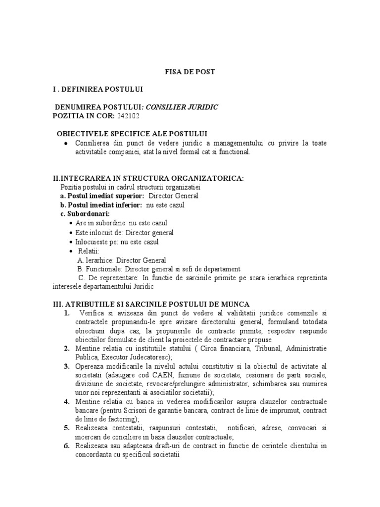 Fisa postului jurisconsult. Nume si prenume sef ierarhic 6. Nume si prenume salariat 4. Cu totii ne intrebam manageri de hr angajatori sau chiar viitori candidati pentru un astfel de post. Specialistii portalcodulmuncii ro precizeaza faptul ca in cadrul oricarei companii pozitia de consilier juridic este una cheie.