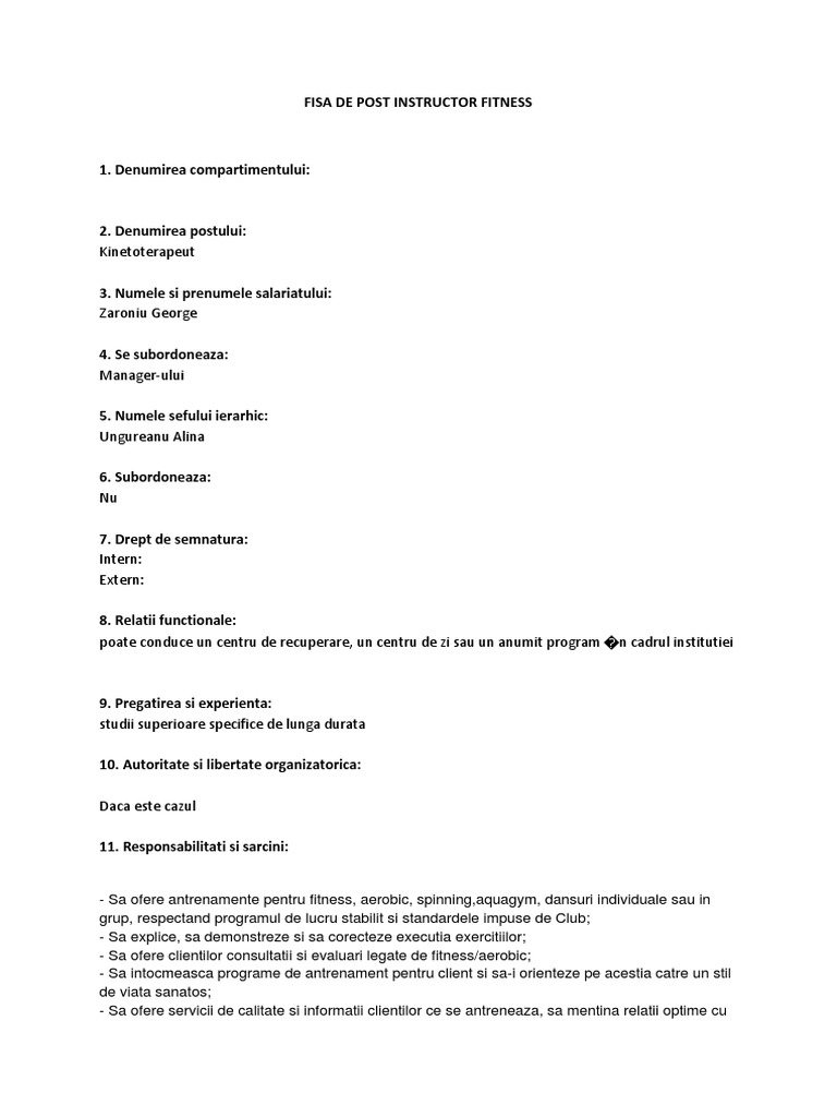 Fisa postului kinetoterapeut. Daca este cazul 13. I 5 nivel ierarhic. Identificarea postului i 1 numele şi prenumele titularului. 1 fişa de post.