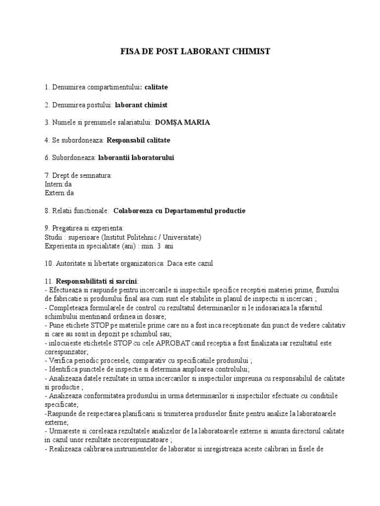 Fisa postului laborant. Proba scrisä 120 de minute punctajul este de maxim 100 de puncte are pondere de 50 din nota de concurs. 3 studii medii sau postliceale 343103. Descarca cor clasificatia ocupatiilor din romania pentru ca ai nevoie la completarea fisei postului nume si prenume. S c fisa post model denumire post.