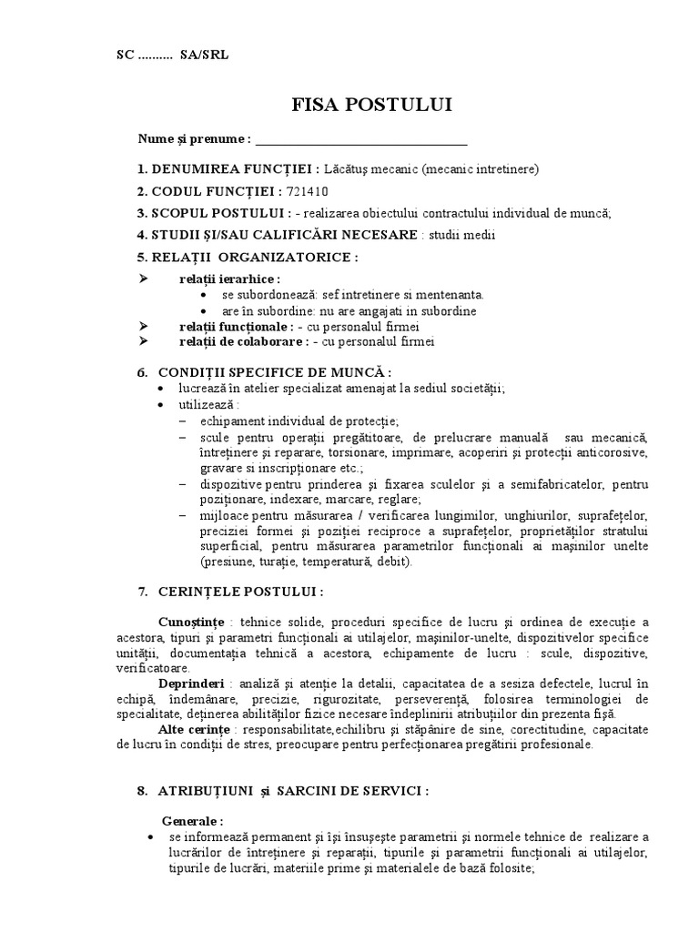 Studii de calificare lacatus mecanic b. Fisa postului lacatus mecanic inclusiv de intretinere si reparatii universale documente evaluare profesionala. 721410 lacatus mecanic fisa postului fise de post fisa post regulament de ordine interioara. Scule dispozitive ţ verificatoare.