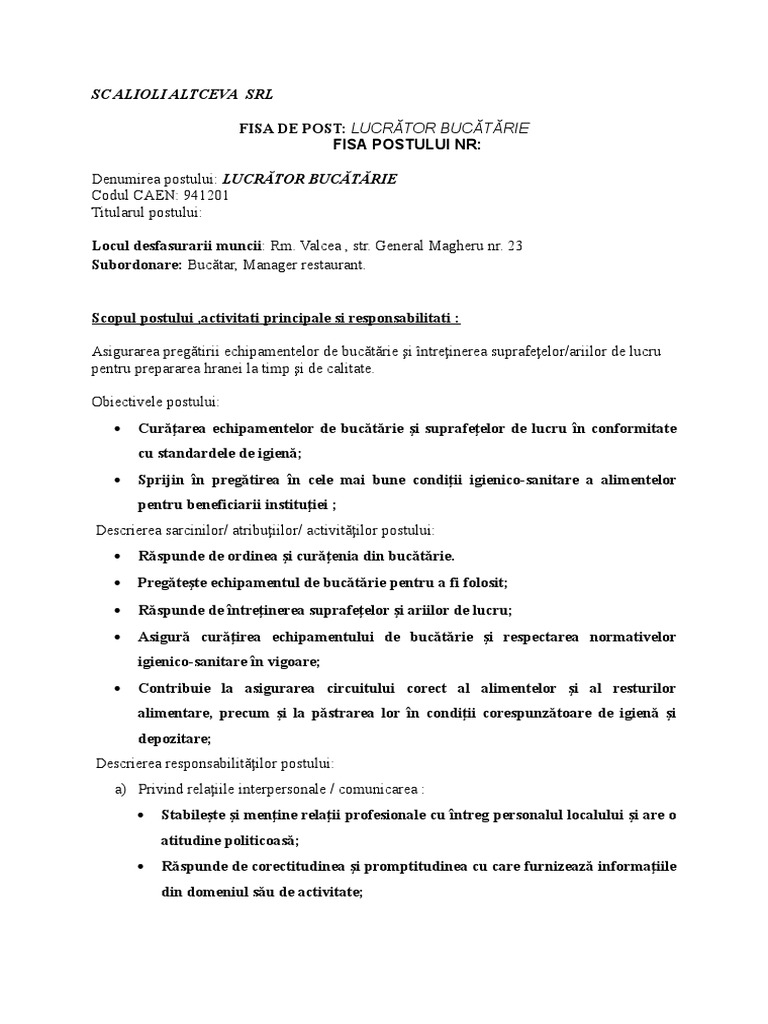 Laurentiu ianculescu 1077 posts expert contabil membru al corpului expertilor contabili si contabililor autorizati din romania tel. Ajutor bucatar lucrator bucatarie minerva 92 srl. Fisa post ajutor bucatar lucrator bucatarie started by otilia alupei oct 11 2011 05 28. Fisa postului lucrator bucatarie spalator vase criterii de evaluare a performantelor in toate fisele de post modelele rubinian au trecut cu succes prin sute de verificari itm.