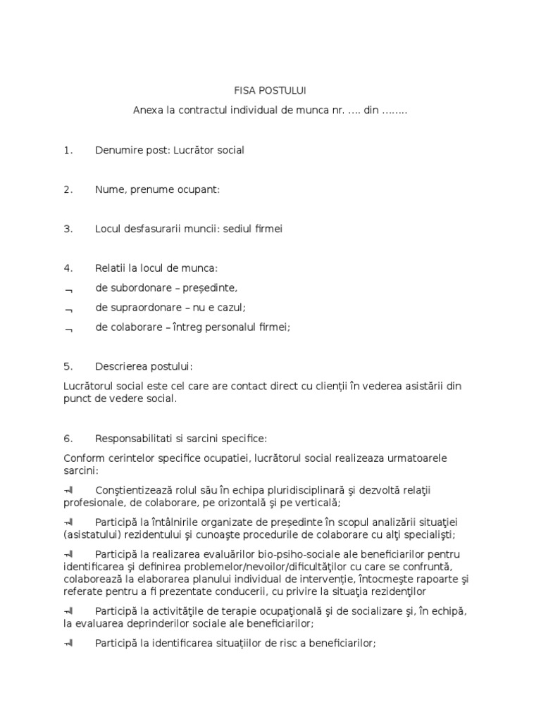 Fisa postului lucrator social. Fisa postului infirmier infirmiera. Fisa postului mediator social. Sa stabileasca. Fisa postului ingrijitor bolnavi la domiciliu.