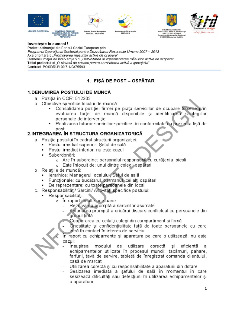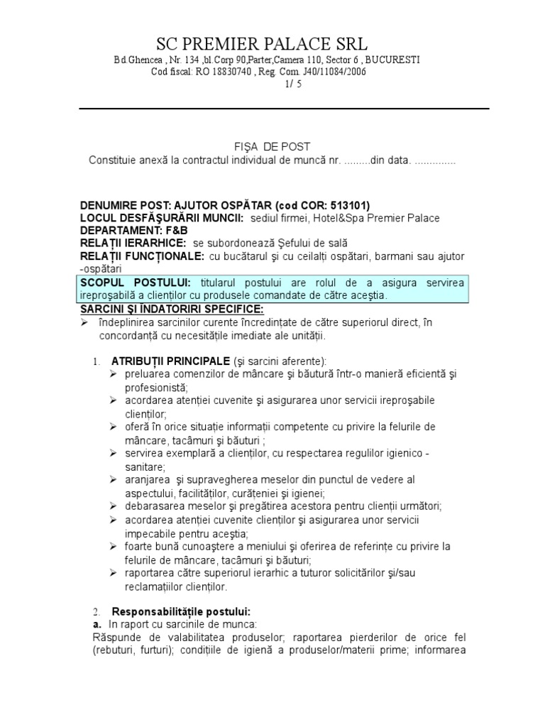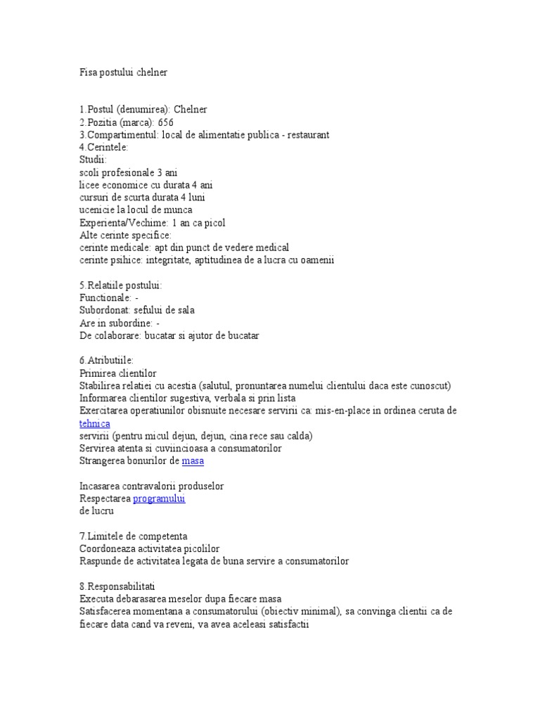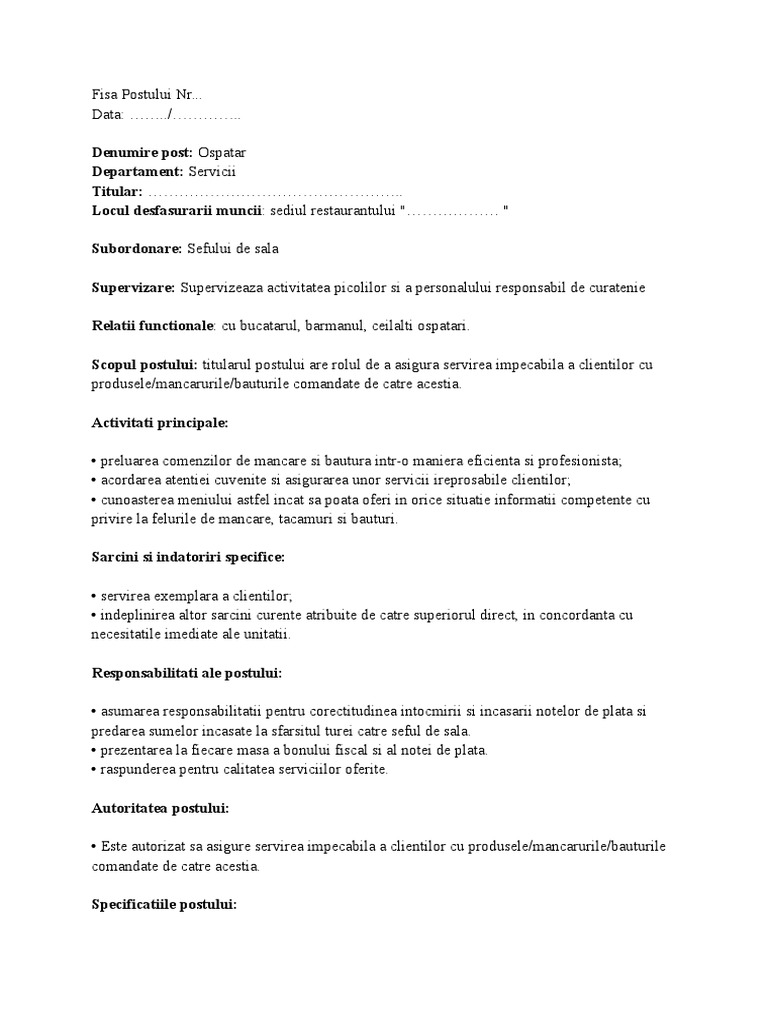 Fisa postului ospatar. Nume si prenume salariat 4. Fisa postului barman ospatar. Fisa postului ospatar chelner fisa evaluare profesionala personalizata raport evaluare calculator si documente cu explicatii. Fisa postului barman ospatar fisa postului barman ospatar.