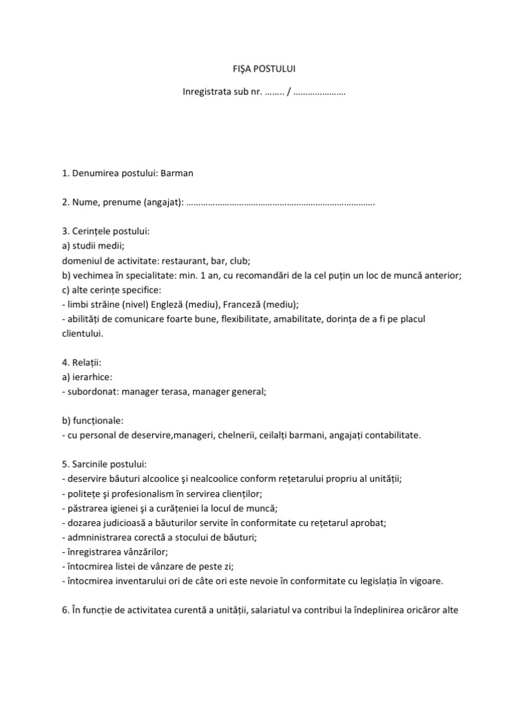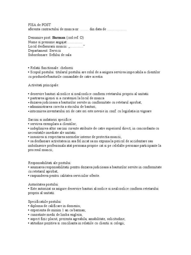 Descarca gratis free download model de fisa postului barman ospatar clasificatia ocupatiilor din romania. Nume si prenume sef ierarhic 6. Numele si prenumele titularului. Promovarea produselor si serviciilor unitatii pentru care lucreaza preluarea comenzilor clientilor servirea preparatelor culinare si servirea bauturilor incasarea contravalorii serviciilor oferite pregateste locul de servire pentru o noua comanda mentine un mediu de munca sigur si curat organizeaza.