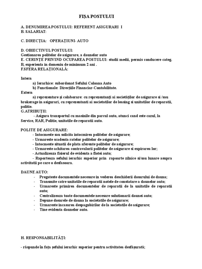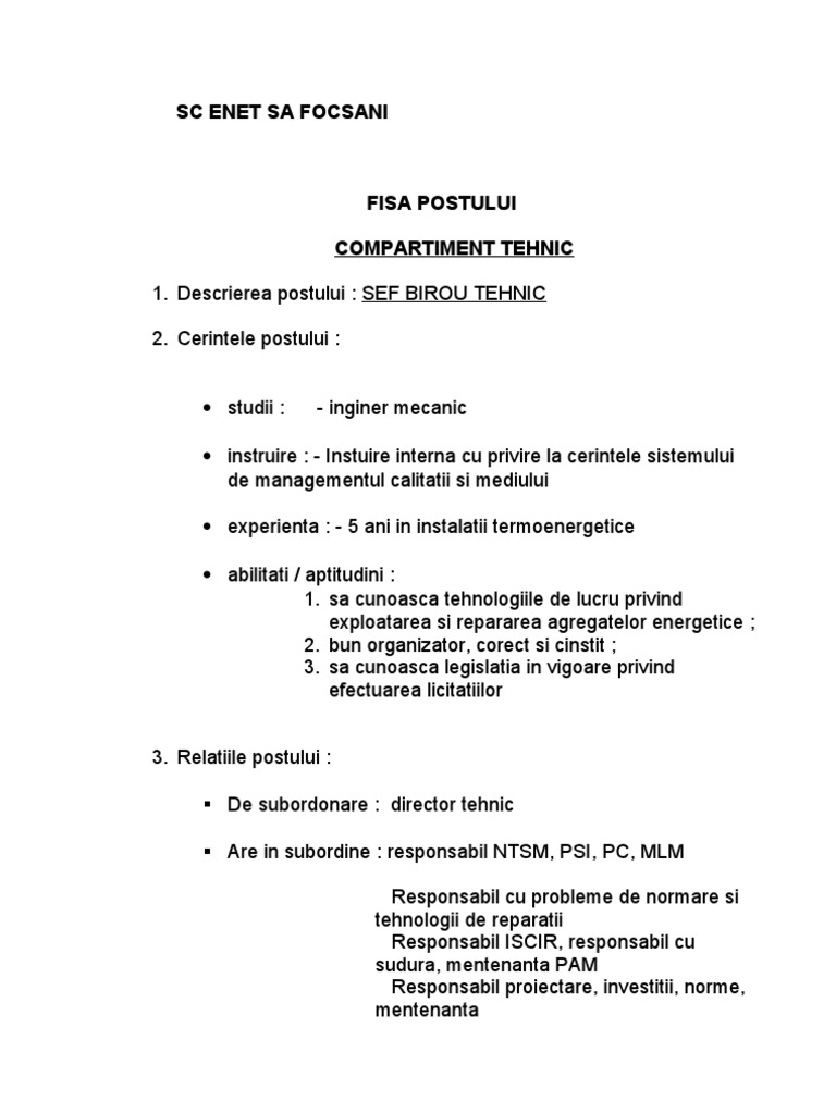 Model fisa postului pentru meseriile de contabil barman agent comercial secretara economist sau administrator si multe altele. Am discutat cu superiorii din cadrul directiei insa raspunsul a fost scurt si sec. Exista 2 nave in subordine deci avem nevoie de ingineri. Scopul principal al postului.