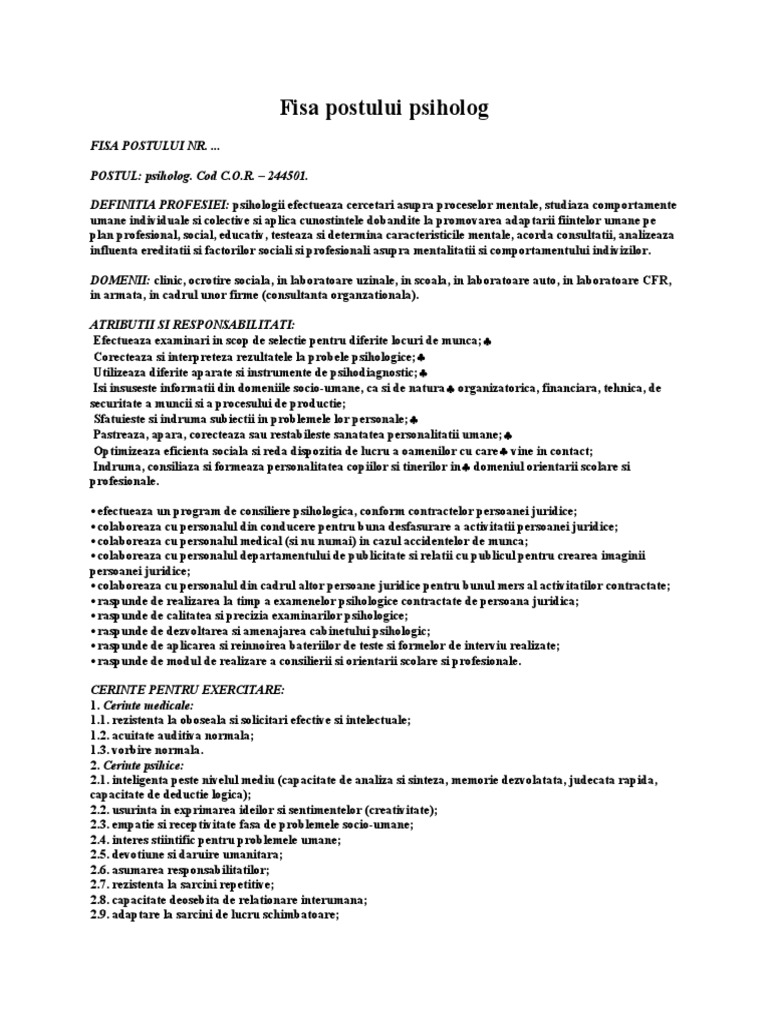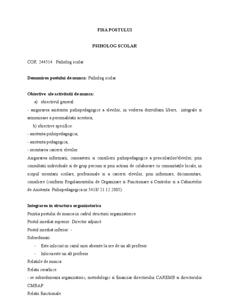 Sarcini administrative specifice postului de psiholog necesare bunei funcționări a proiectului pentru o vedere globală cu privire la baza teoretică vă rugăm să consultați. Fisa postului psiholog scolar. Criterii de evaluare a performantelor in toate fisele de post modelele rubinian au trecut cu succes prin sute de verificari itm. De specialitate superioare 2.