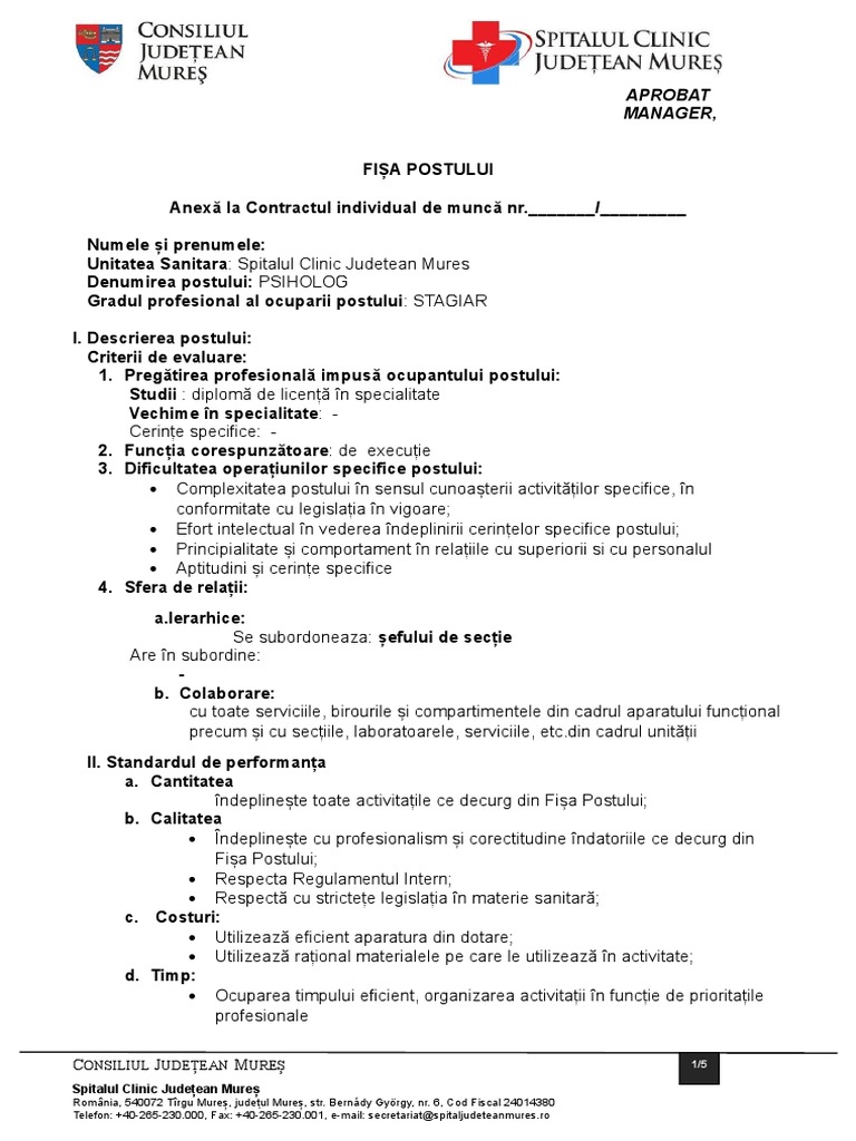 Suport informativ si practiv în realizarea la cele mai înalte standarde profesionale a serviciilor de consultantã resurse umane. Fisa de post psiholog. Mureş secţia clinică obstetrică ginecologie ii. 21 pagini document editabil 10 iulie 2020.