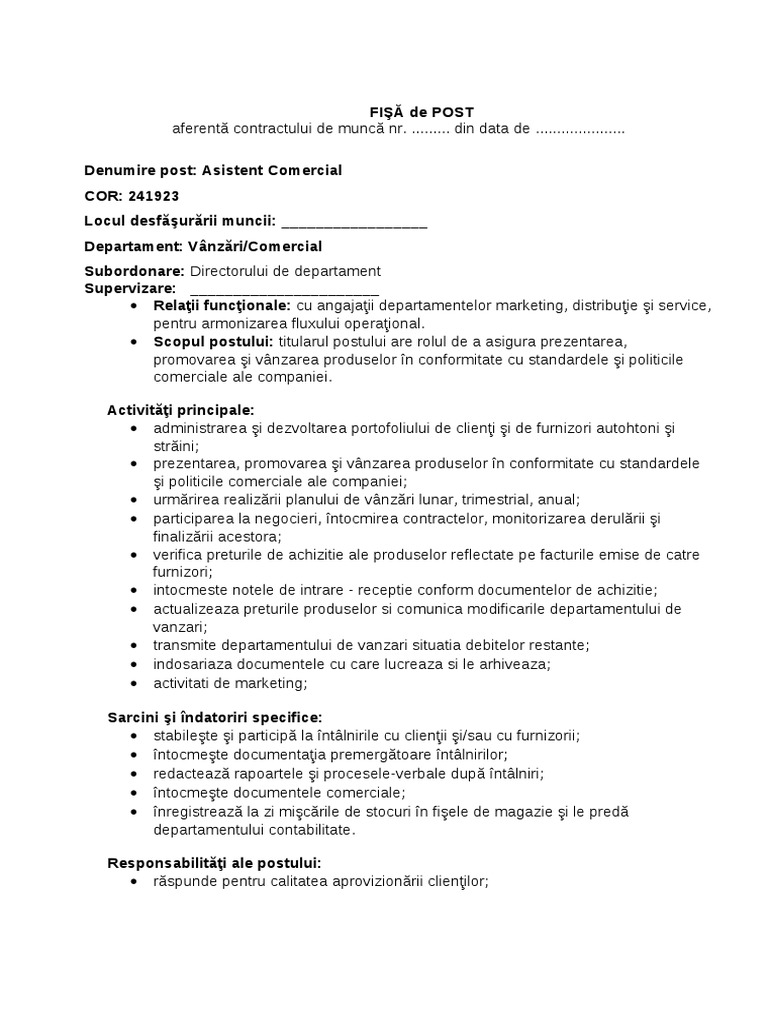 3 studii medii sau postliceale fisa postului agent vanzari. Numele si prenumele salariatului. Scopul postului se va regasi detaliat in obiectul contractului definit in cim semnat de parti 2 obiectivele postului. Fisa postului extinsa reprezentant vanzari.