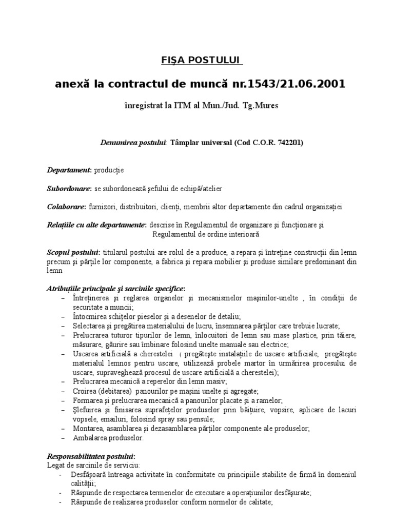 53 2003 completata cu legea 40 2011 şi al contractului de muncă înregistrat în registrul de evidenţă a contractelor individuale de muncă sub nr 1815 08 06 2016 se încheie astăzi. 752201 tamplar universal. Grupa majora 7 muncitori calificati si asimilati subgrupa majora 75 muncitori calificati in industria alimentara prelucrarea lemnului confectii si alti lucratori asimilati. Fise de post fisa de post fisa de post actualizata fisa de post completa fisa de post complexa fisa postului ultima actualizare 2017.