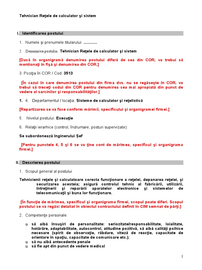 Tehnician reţele de calculator şi sistem dacă în organigramă denumirea postului diferă de cea din cor va trebui să mentionaţi în fişă şi denumirea din cor 3. Tehnician echipamente de calcul si retele cod cor 351103. 311306 tehnician energetician electrician fisa postului fise de post fisa post regulament de ordine interioara.