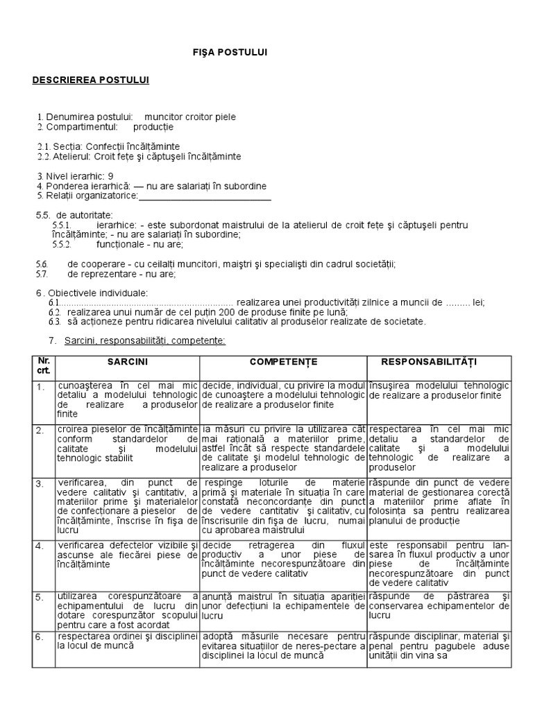 Aceste documente obligatorii pentru ocupantul postului de ucenic cod cor 962904 sunt complet întocmite respectând cerințele codului muncii. Fisa de post ucenic bijutier. Numele si prenumele salariatului. Fisa postului paznic documente evaluare profesionala.