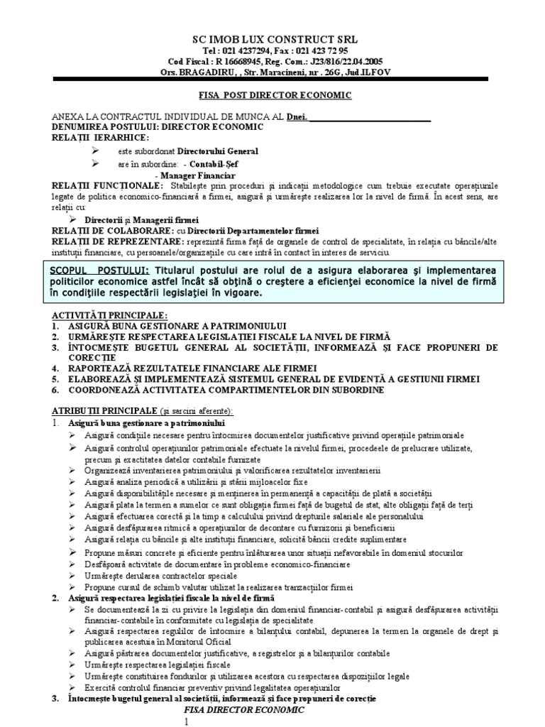 Fisa postului model doc fisa postului model pdf fisa de post manager general fise de post.