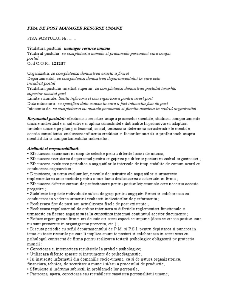 2 solutii pentru a nu afecta activitatea companiei completati va lista cu noile fise intocmite de specialisti pentru angajatii din firma dvs. Scopul general al postului asigurarea si mentinerea unui sistem unitar de resurse umane calificate si competente pentru indeplinirea obiectivelor firmei. Fişa postului pentru un asistent manager se aseamănă foarte mult cu fişa unui post de secretariat persoanele cu funcţii pot fi managerii ceo directorii şefii de. De exemplu un office manager în cadrul unui mic birou de avocatură poate avea numai atribuţii de întâmpinare a clienţilor de programare a întâlnirilor şi de facturare.
