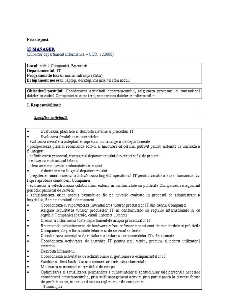 Fisa Postului Unui Manager