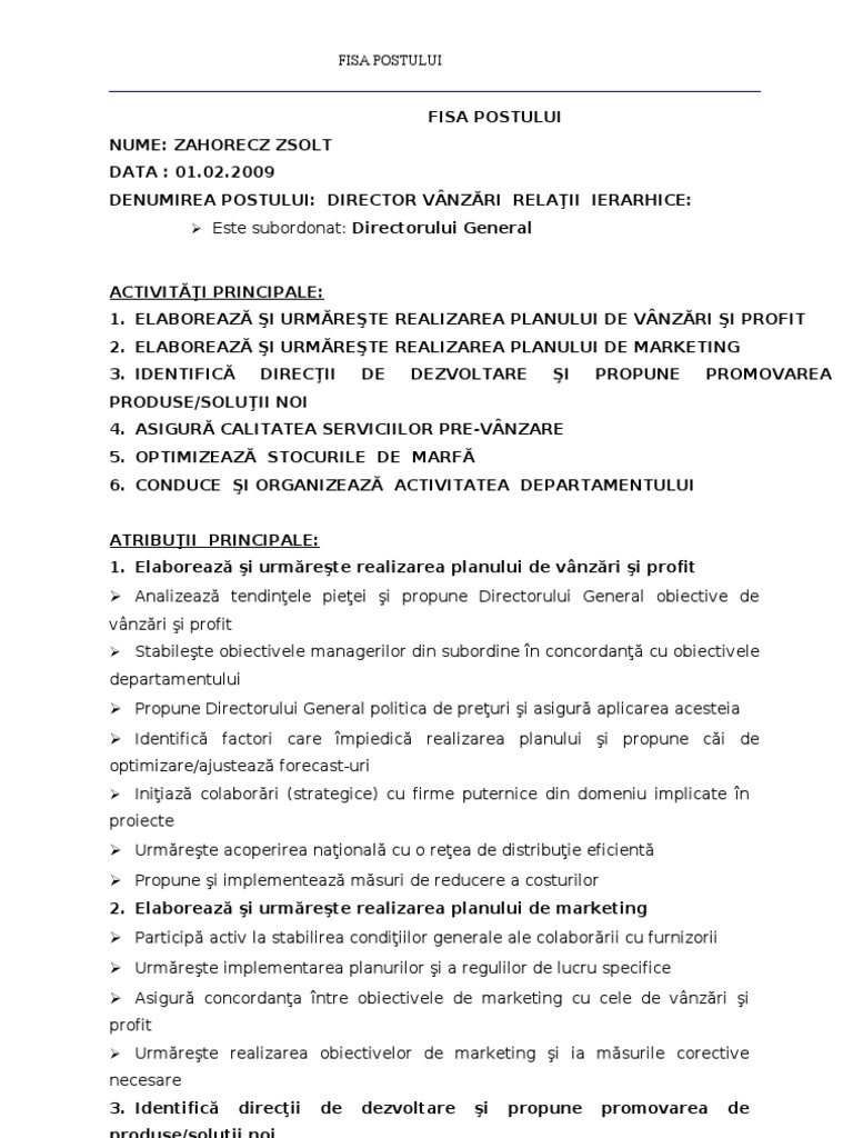 In acest caz denumirea din cor este reprezentant comercial. Criterii de evaluare a performantelor in toate fisele de post modelele rubinian au trecut cu succes prin sute de verificari itm. Identificarea postului numele si prenumele titularului. Fisa de post director vanzari si marketing.